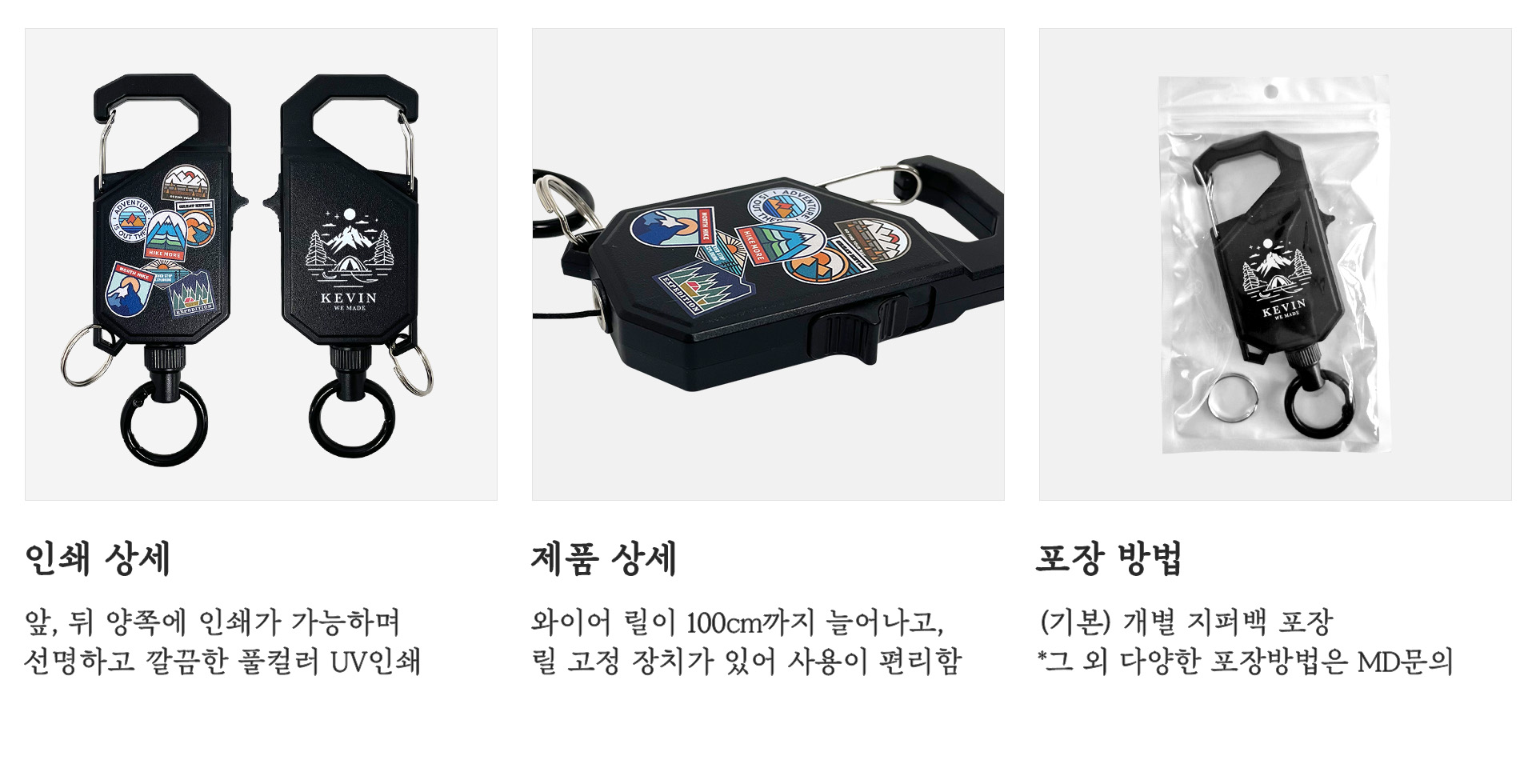최대 100cm까지 늘어나는 와이어가 내장되어 있어, 가방에 카라비너로 편리하게 걸고 손쉽게 당겨올 수 있도록 제작된 와이어릴 카라비너입니다.