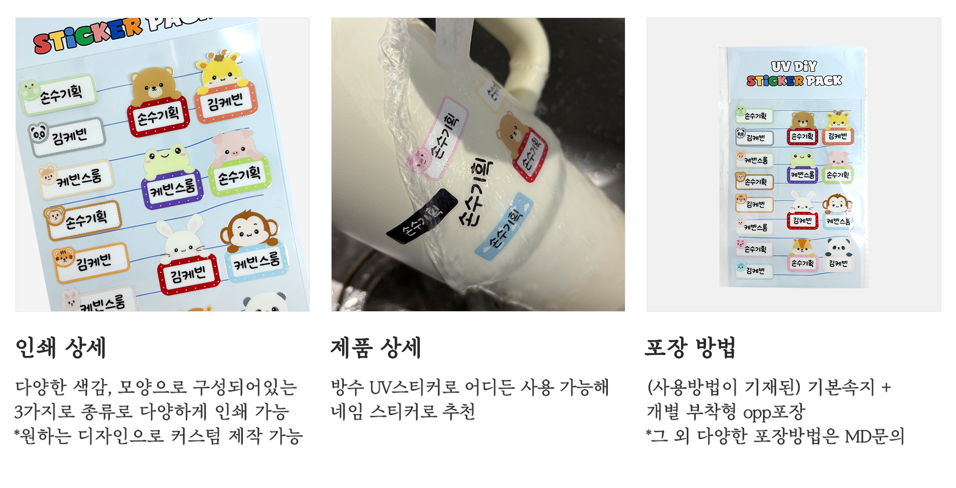 방수, 강한 접착력, 스크래치에 강하며 깔끔한 면이라면 어디든 잘 붙어 어린이들을 위한 유치원 굿즈 또는 브랜드 굿즈로 추천드립니다.