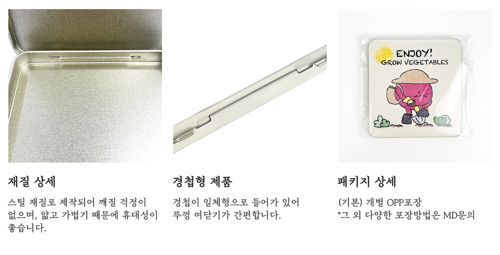 | 납작 틴케이스 | 95 x 100 mm (높이:10mm) | (앞) 95 x 100 mm 이내 (뒤) 77 x 83 mm 이내 |