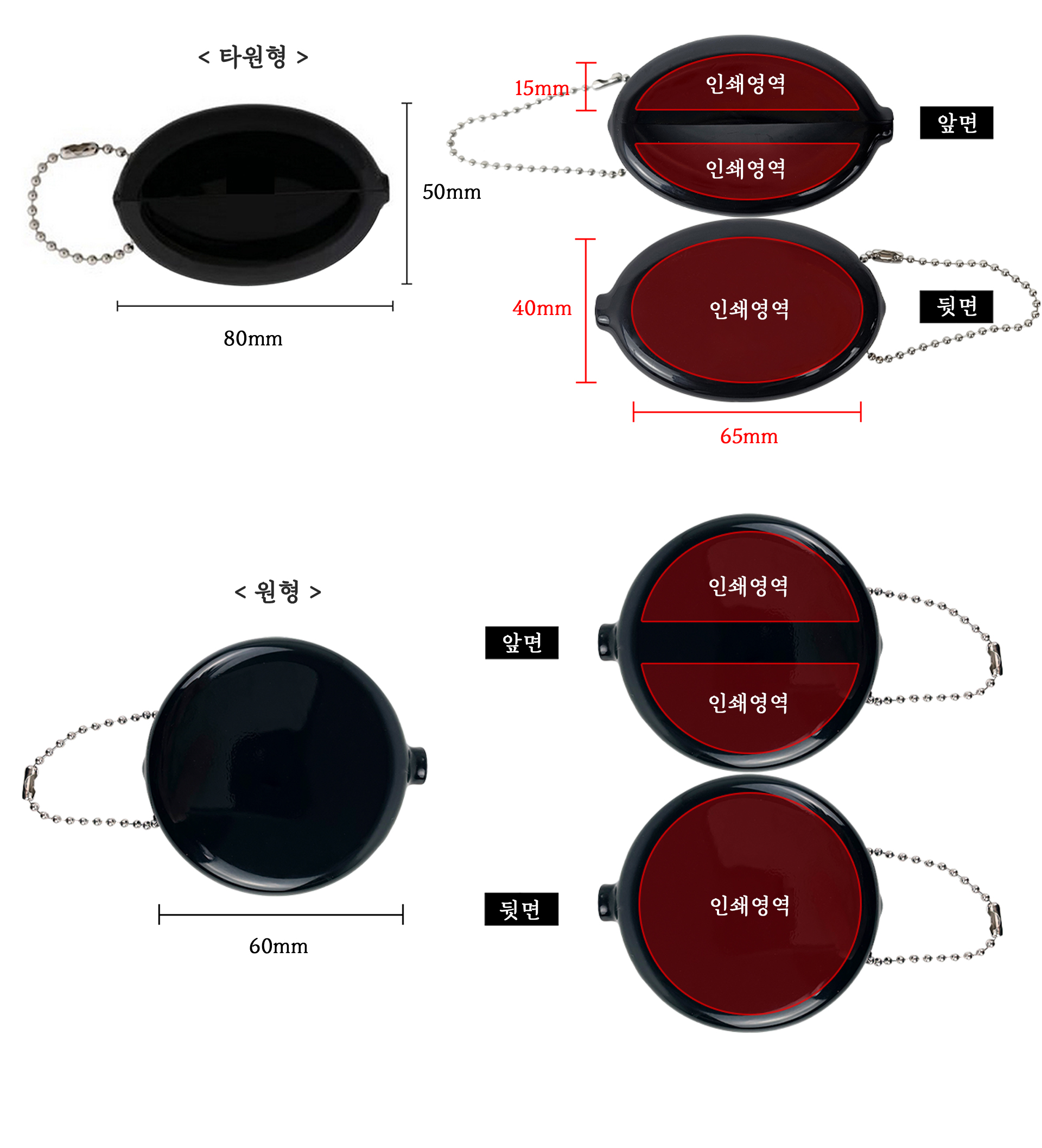 | PVC 동전지갑 키링 | (타원형) 80 x 50 mm (원형) 60 x 60 mm | (타원형) - 앞면 : 65 x 15 mm (위, 아래 인쇄 가능) - 뒷면 : 65 x40 mm (원형) - 앞면 : 50 x 20 mm (위, 아래 인쇄 가능) -뒷면 : 50 x50 mm |
