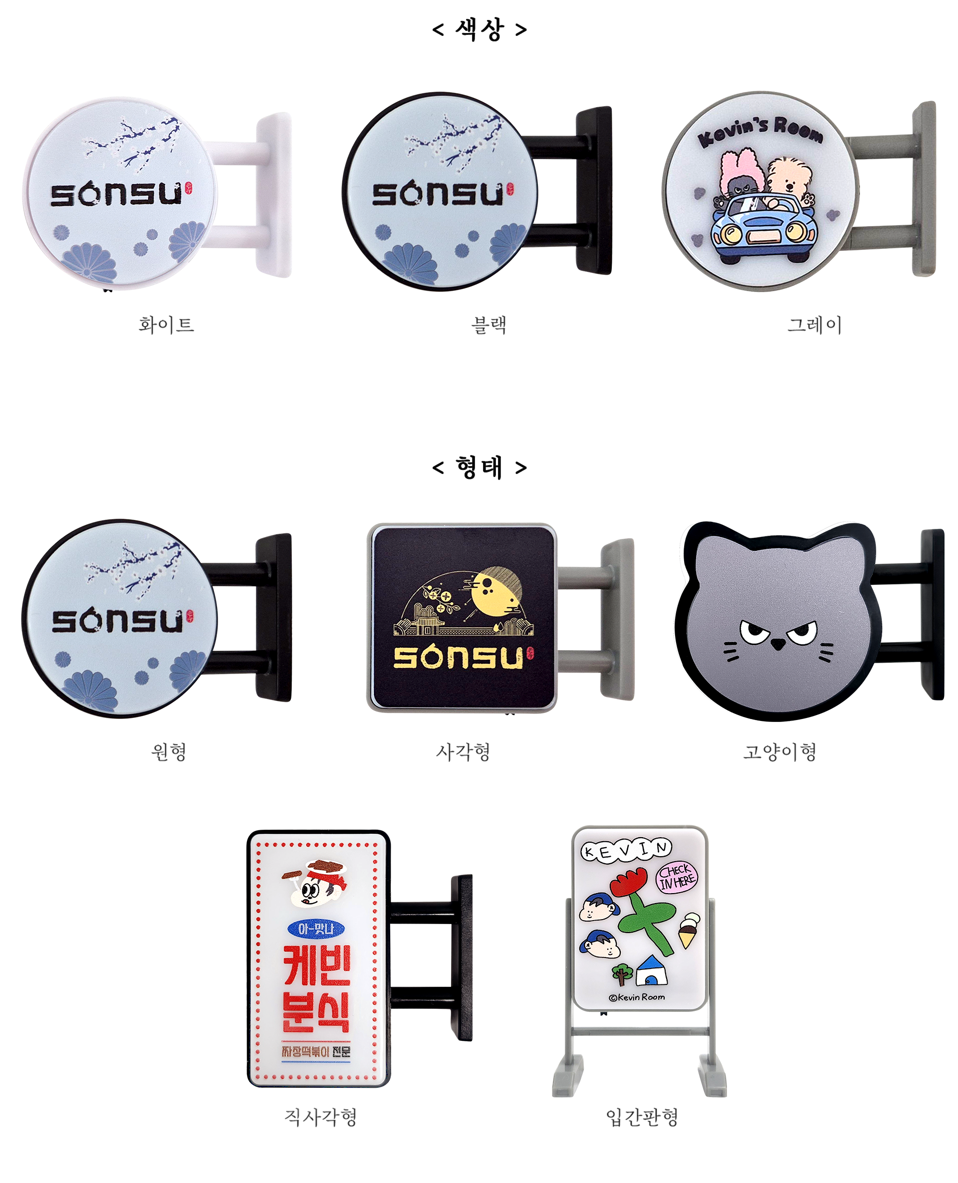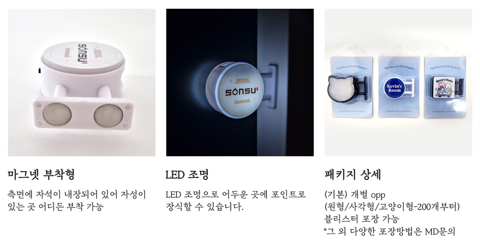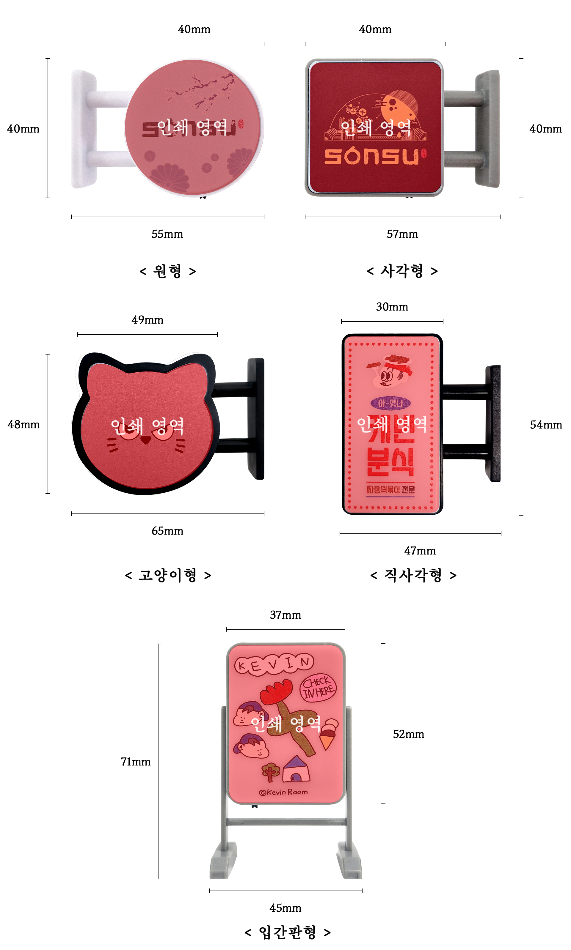 | LED 간판 마그넷 | (원형) 55 x 40 x 20 mm (사각형) 57 x 40 x 20 mm (고양이형) 65 x 49 x 28 mm (직사각형) 47 x 54 x 16.5 mm (입간판형) 45 x 71 x 16.5 mm | (원형/사각형) 40 x 40 mm 이내 (고양이형) 43 x 42.8 mm 이내 (직사각형) 28 x 52 mm 이내 (입간판형) 35 x 49 mm 이내 |