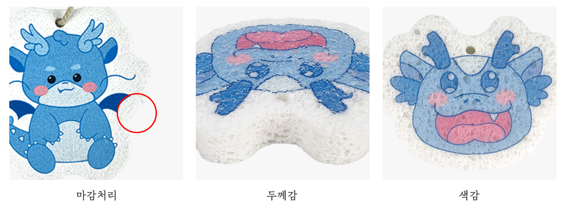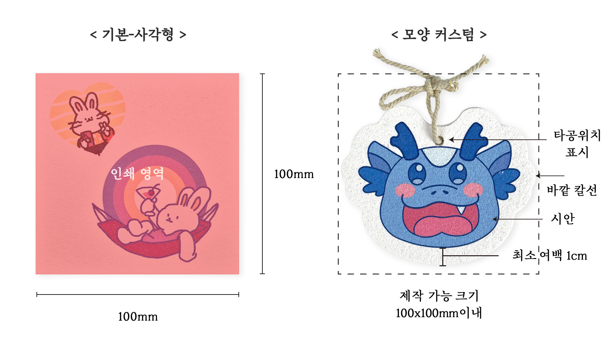 | 셀룰로오스 압축 수세미 | (기본-사각형/모양 커스텀) 100 x 100mm (원형) 84 x 84mm (사각형) 86 x 86mm (타원형) 84 x 116mm (직사각형) 71x 105mm | (기본-사각형/모양 커스텀) 100 x 100mm 이내 (원형) 84 x 84mm 이내 (사각형) 86 x 86mm 이내 (타원형) 84 x 116mm 이내 (직사각형) 71x 105mm 이내 |